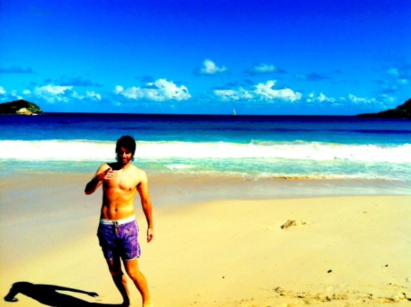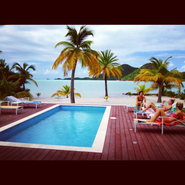 Being honest, I thought it was just going to be like a cool holiday villa. Didn’t expect it to be a beach front mansion. Private beach, might I add. So we walk in. Kind of a court yard situation going on. Plants and trees just inside the front door. One huge bedroom here. Another over there. And again. And another. HUGE King sized bed in each. You could roll over at least seven times and still not fall out. On we go to the living room area. Dining room. Other living room. Open plan. Nice and breezy. Master bedroom over there. Kitchen over there. See a little bird eating some fruit by the fridge. Ah isn’t that lovely… Suddenly you’re not fully listening to the tour guide. Because all you can see is your ridiculous view out the big swinging french doors. Jacuzzi. Pool. Palms trees. Private beach. Open ocean. This. Is. UN. REAL. Seriously. One of the best views I’ve ever seen. In the distance you have some lush green hilly islands. Beautiful view of the ocean out to the horizon. Sailboats way in the distance. Tropical birds flying around. Paradise! Untouched. Untamed. Unbelievable!