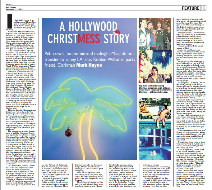 Past two Christmases have been slightly different. Still do the same things. Charades. Quiz. Eat. Turkey. Just not the same as home. Now I can be found in an abode high up in the Hollywood Hills. Rob’s Christmas night party. Come along. Have some fun. Big group of people. All walks of life. Musicians. Actors. Models. Prancers. Producers. Me. Maybe about thirty or forty in total. Not sure. I’m bad with numbers. But between five and a hundred people. Roughly. Mostly expats. One Pat. Handful of Americans. Tiny Tims away from our original homes. All bringing our own Christmas spirit to the party. Keeping the dream alive. Particularly as Rob always make sure there is Guinness in the fridge for me. Mighty host.